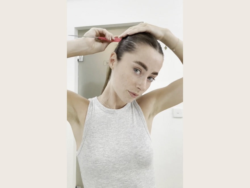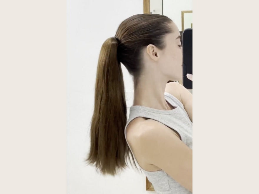 Style your hair into a smooth ponytail by brushing out any tangles. Secure it firmly with a hair tie to create a stable base for your extensions or style.